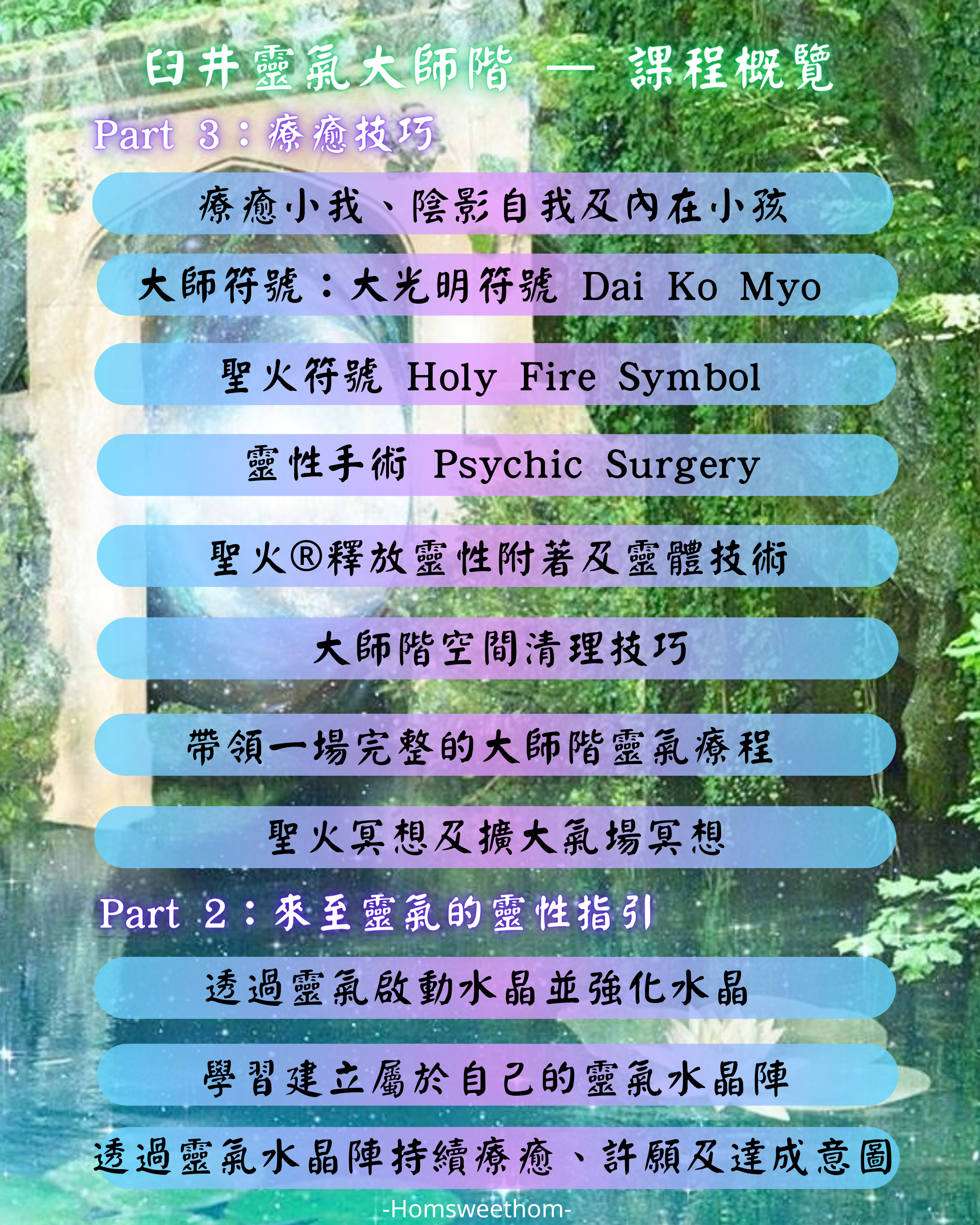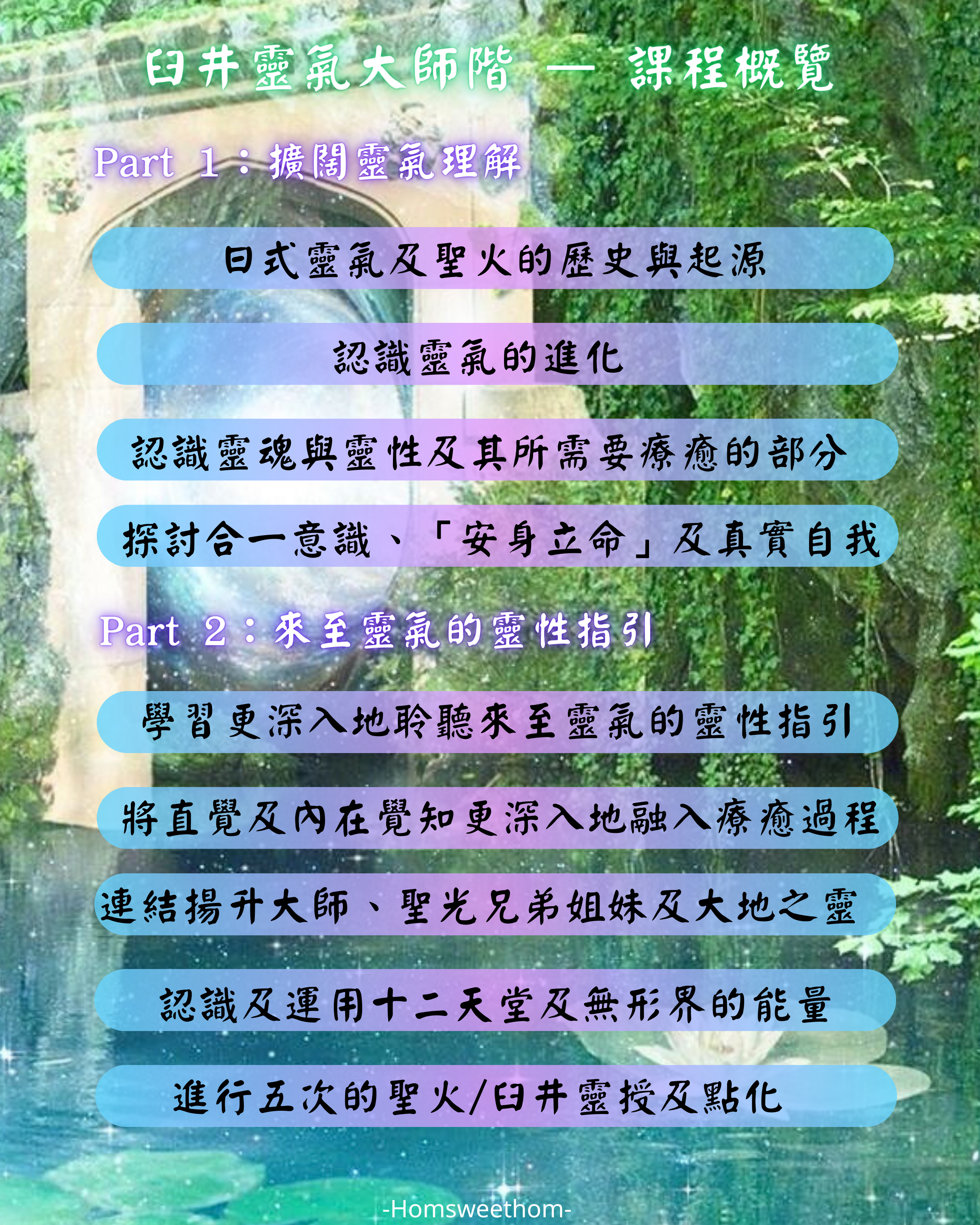 - 進階傳統日本靈氣手法技巧(邪氣切除法、凝視法、呼氣法)