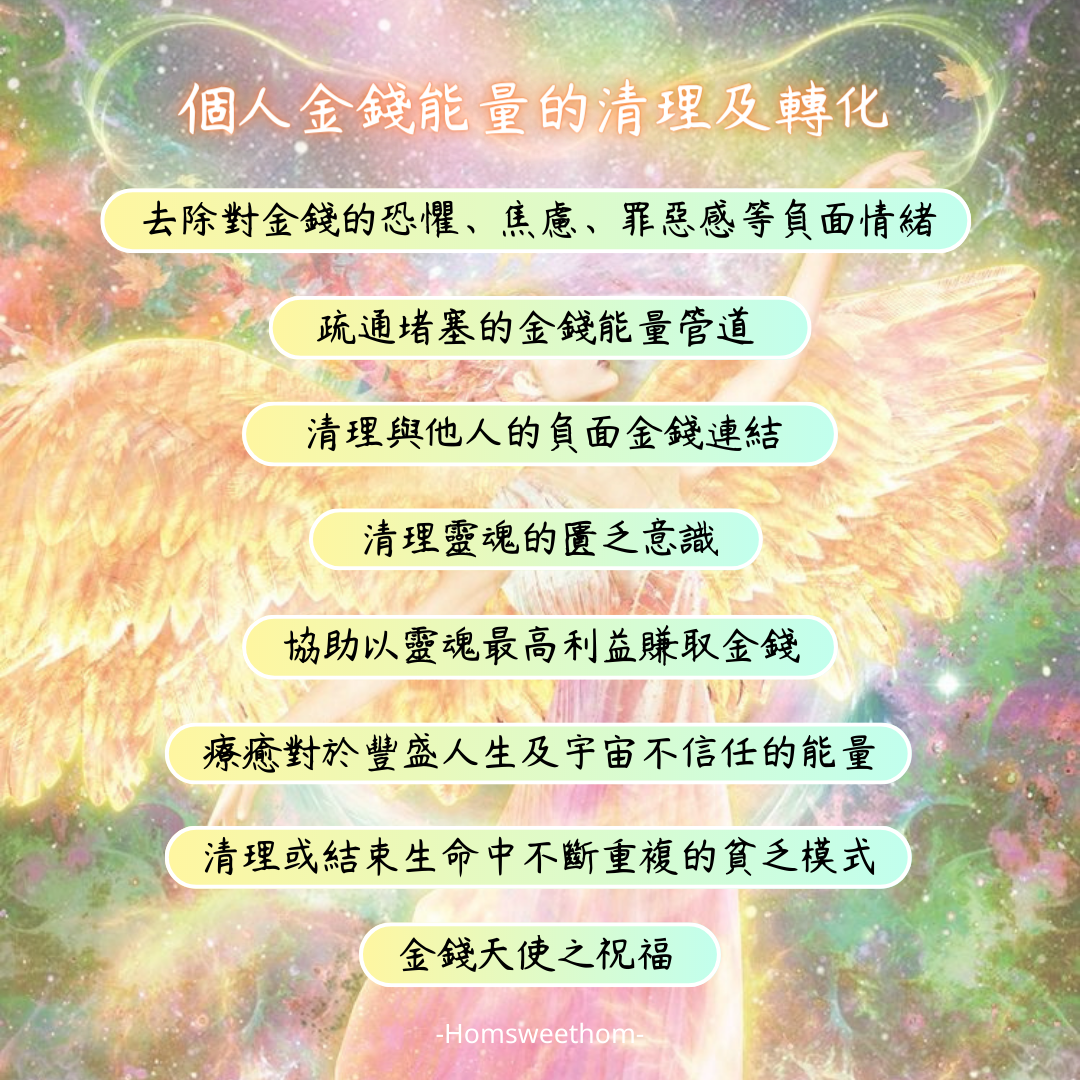 金錢靈氣不單可以療癒金錢,還包括財富資產、工作機會、人脈、資源、貴人運、成功、愛等元素。此服務幫助大家打破貧乏的信念框架,協助改變舊有匱乏的行為模式,同時打開和擴闊金錢能量管道,迎接生命本來存在的豐盛能量。