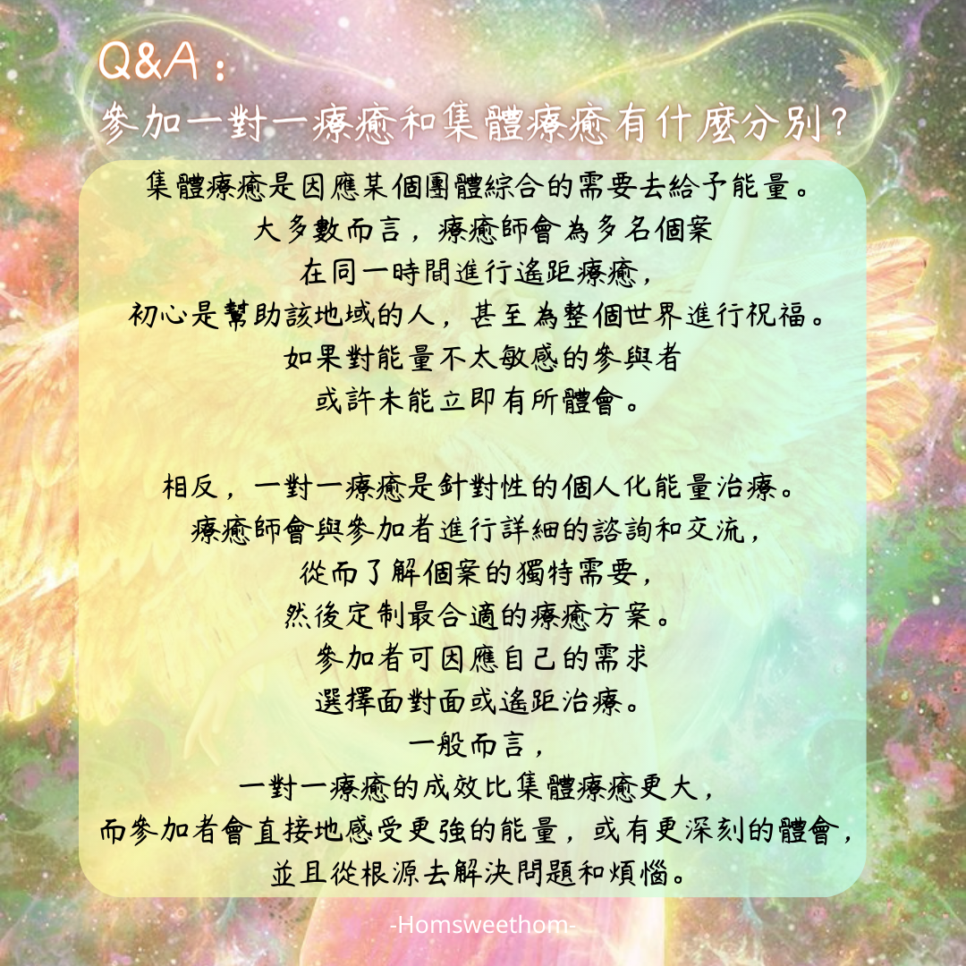 – 參加一對一療癒和集體療癒有什麼分別?