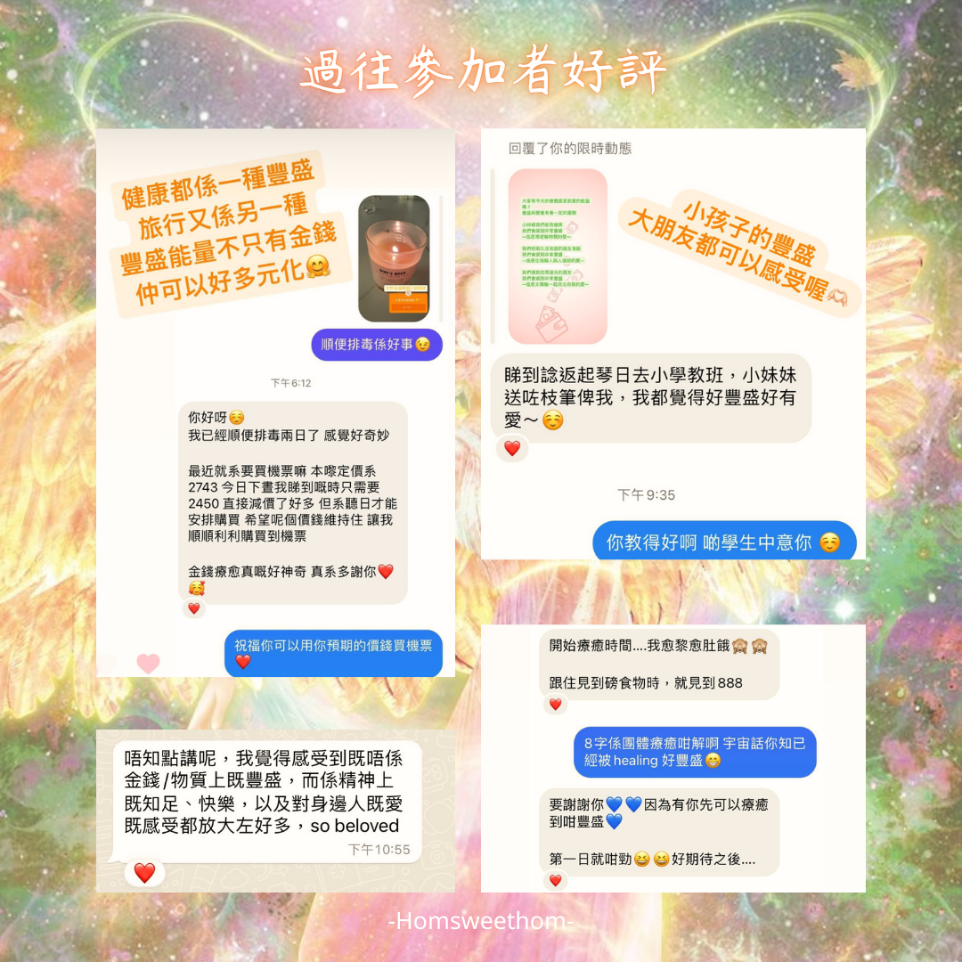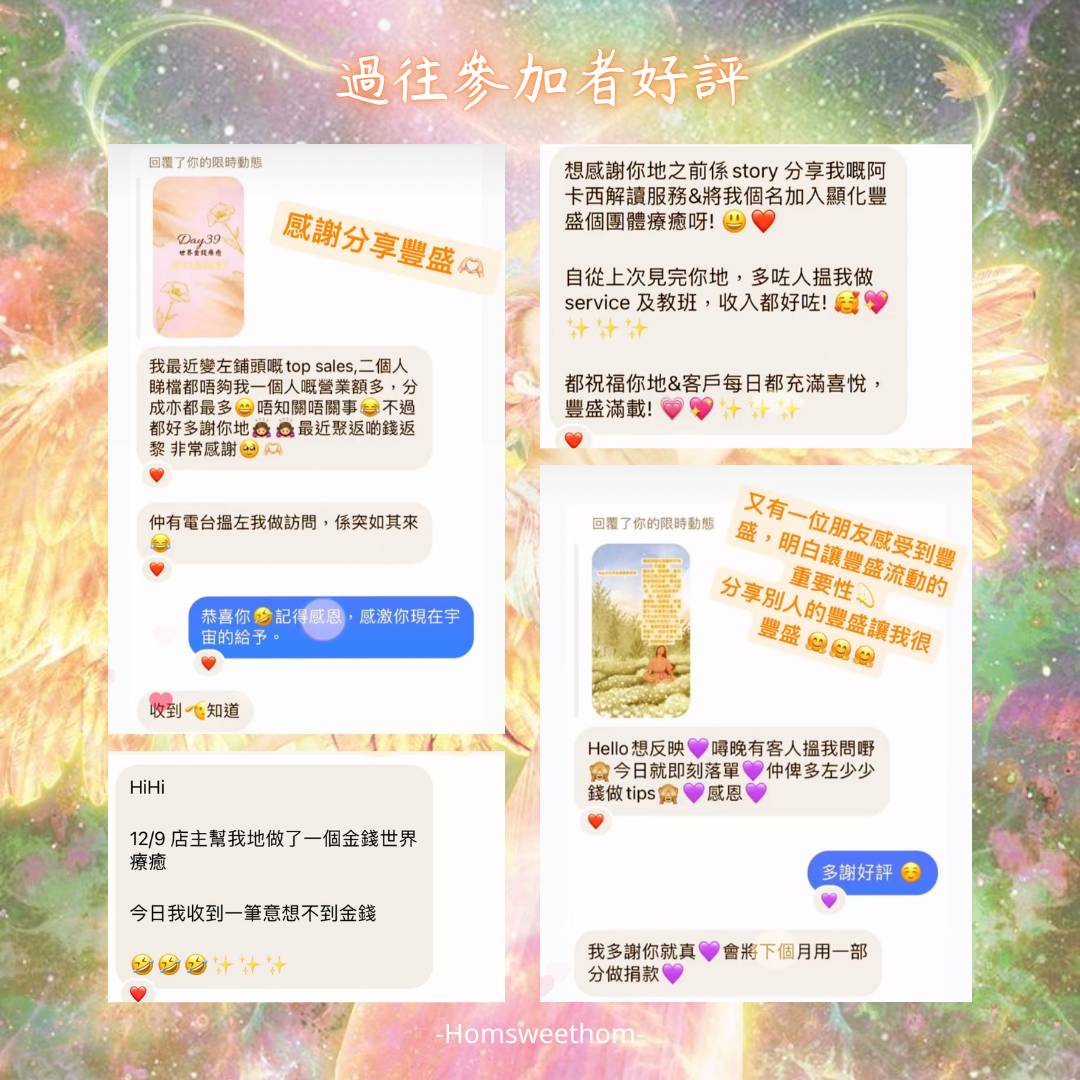 無論是有志在事業上取得更大成就的你,抑或想創業、置業/投資的你,還是希望擁有財富自由的你,金錢靈氣服務都能幫助你提升金錢頻率,體驗更美滿光明的人生,並且以豐盛的力量活出生命最高最善的藍圖。